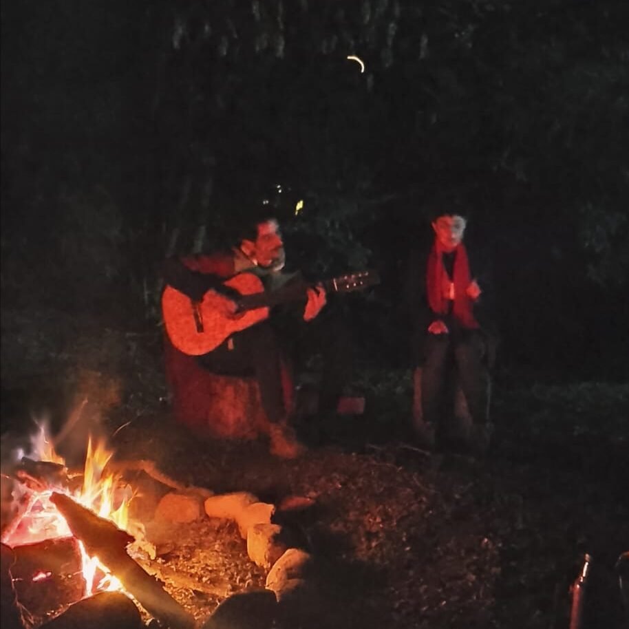La jornada comenzó con una propuesta original: un escenario 100% natural, sin estructura, luces ni micrófonos. Solo un fogón iluminado por la luna, rodeado por artistas y asistentes. En ese marco, La Pilu, acompañada por Marcelino en guitarra acústica, interpretó sus canciones, que por su esencia se ajustaron perfectamente al ambiente. En el mismo formato se presentó New Rusia a la Vinagrèt, que estrenó “El balcón de Jimena”. Mientras que en “El ciego” se destacó el acompañamiento espontáneo de un coro femenino del público.